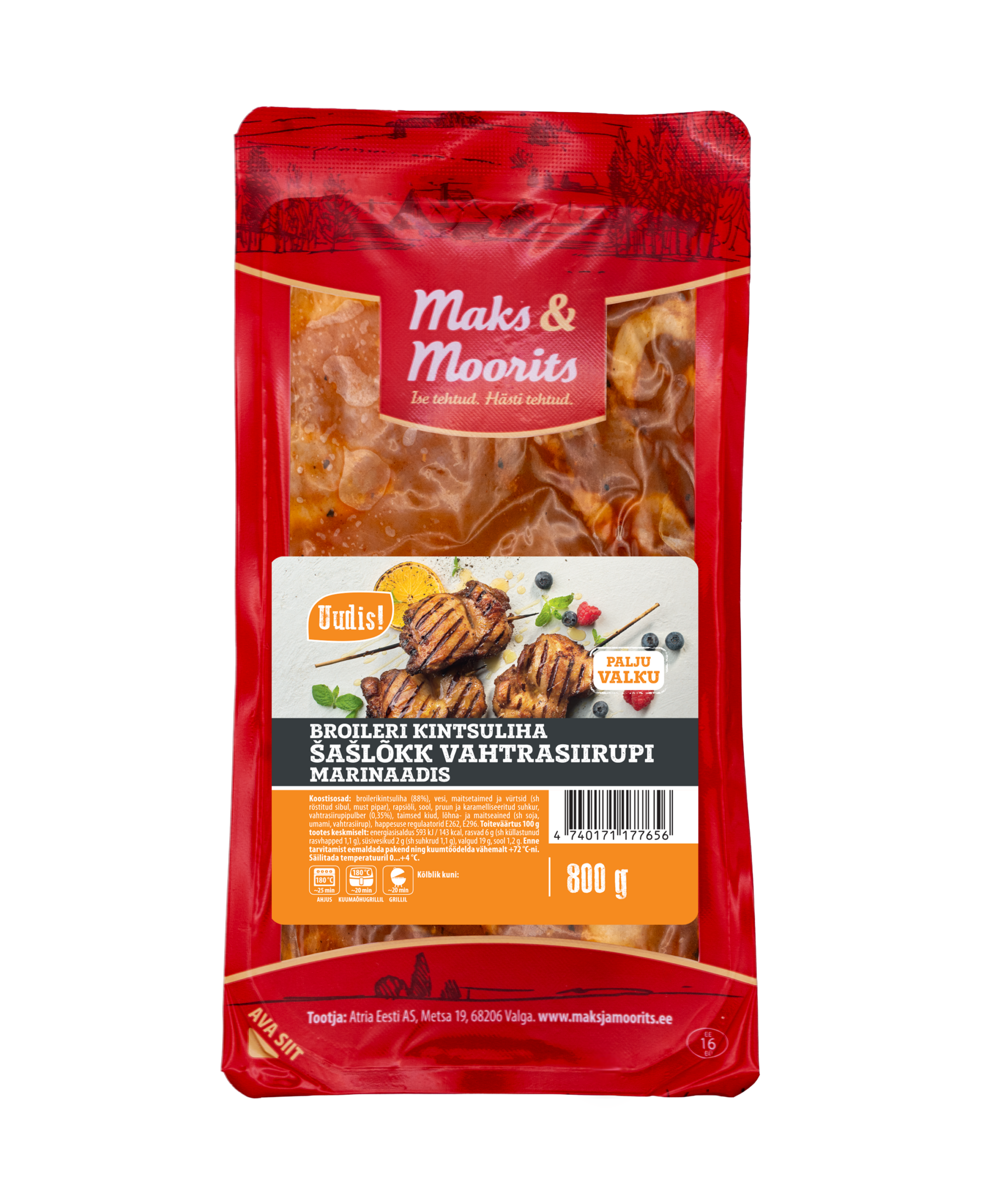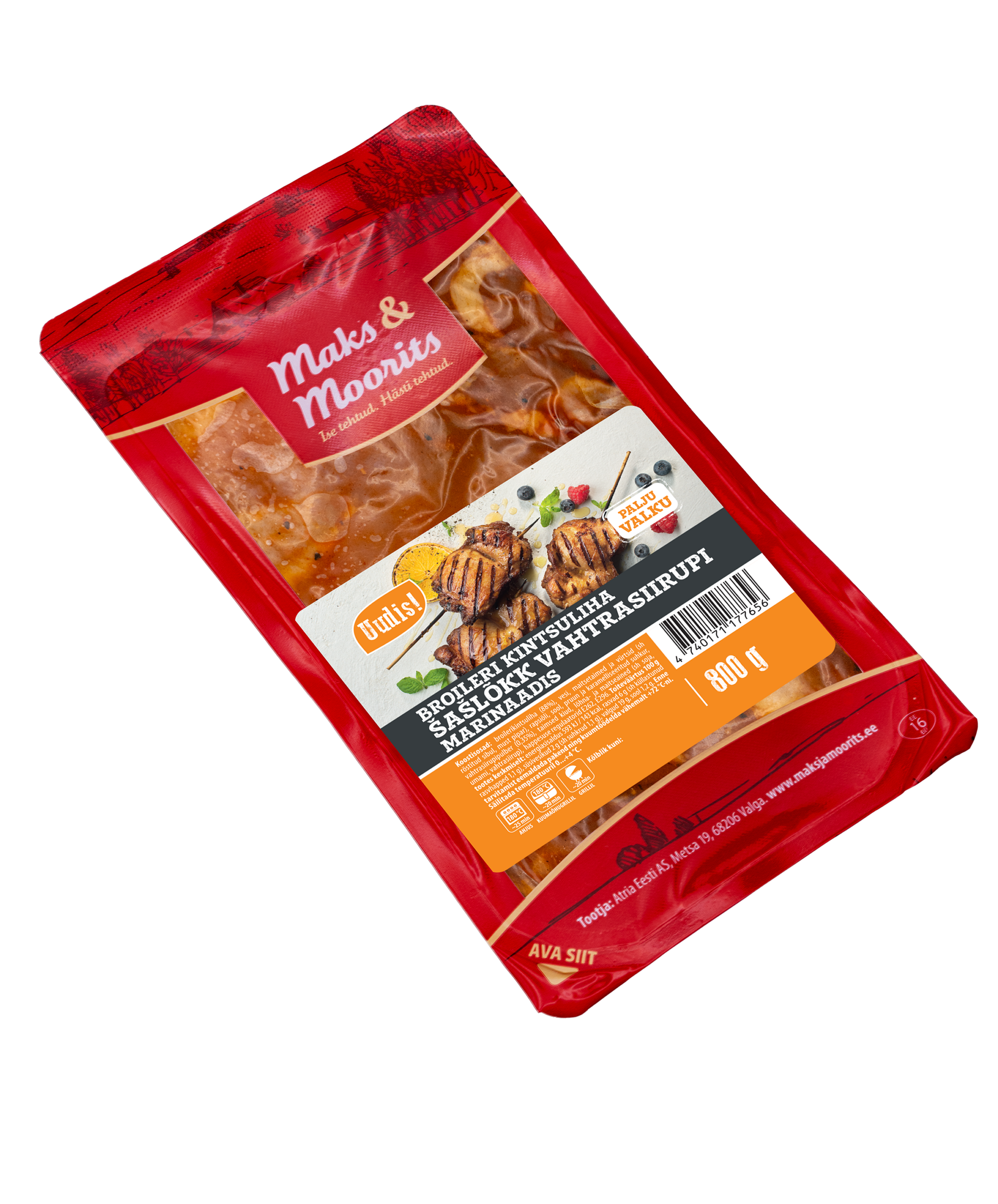 Broileri kintsuliha (88%) šašlõkk, mis on kergelt magusa vahtrasiirupi marinaadis. Midagi uut ja erilist sinu igapäevasele valikule