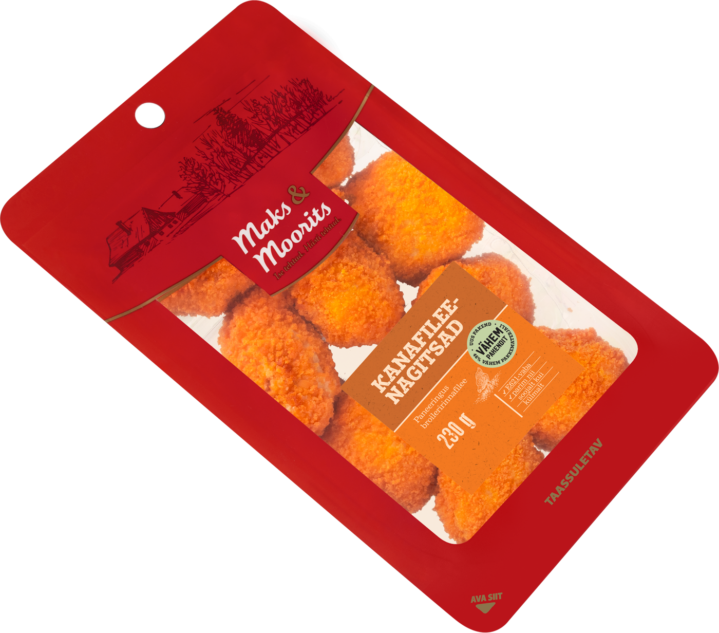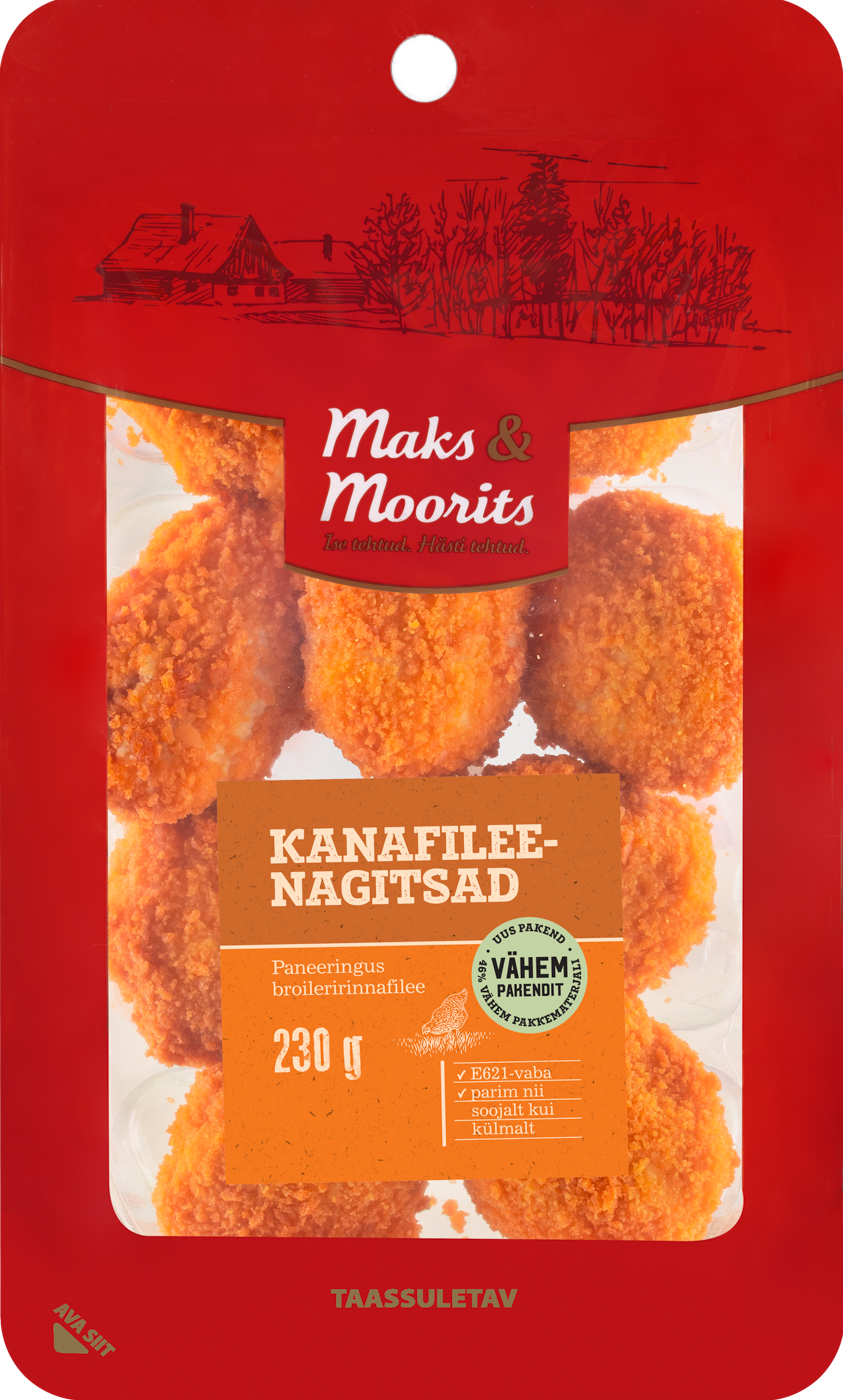 broileri rinnafilee (50%), paneering (sh kuivikupuru (sh nisu), nisujahu, nisumanna, nisugluteen, tärklis, sool, pärm, päevalillerasv ja -õli, paprika, toiduvärv E160b), vesi, kanamuna, tärklis, sool, taimsed kiud, dekstroos, maitsetaimed, vürtsid, lõhna- ja maitseained, pärmiekstrakt, suhkur, happesuse regulaatorid E262, E331; maltodekstriin, antioksüdant E301. Küpsetatud rapsiõlis.