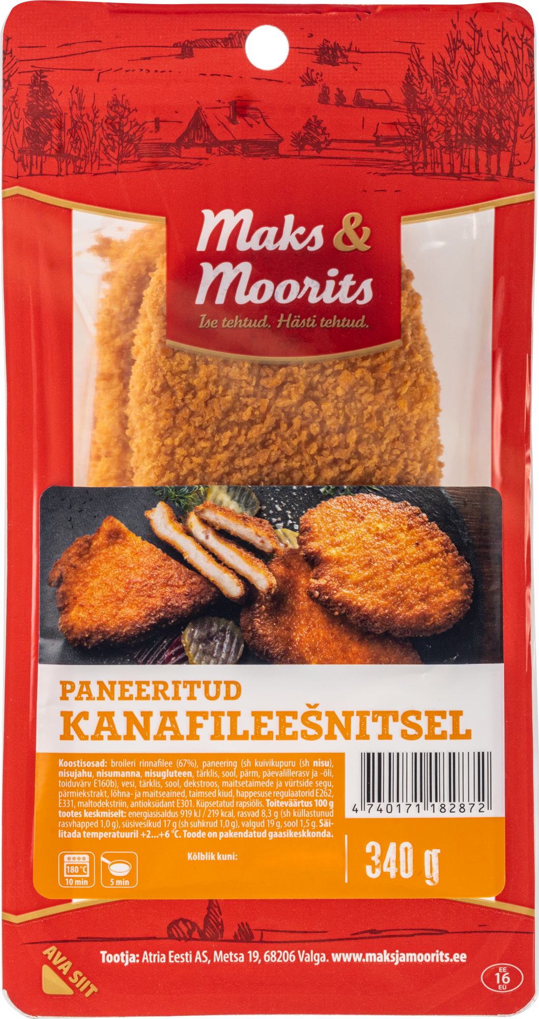 broileri rinnafilee (67%), paneering (sh kuivikupuru (sh nisu), nisujahu, nisumanna, nisugluteen, tärklis, sool, pärm, päevalillerasv ja -õli, toiduvärv E160b), vesi, tärklis, sool, dekstroos, maitsetaimede ja vürtside segu, pärmiekstrakt, lõhna- ja maitseained, taimsed kiud, happesuse regulaatorid E262, E331, maltodekstriin, antioksüdant E301. Küpsetatud rapsiõlis.